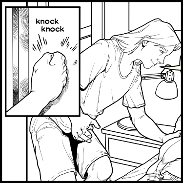 PANEL ONE: GLENN comes into DYLAN’s bedroom. It’s morning. He’s calling for Dylanto wake up. He knocks on the doorframe as he walks in to the room.