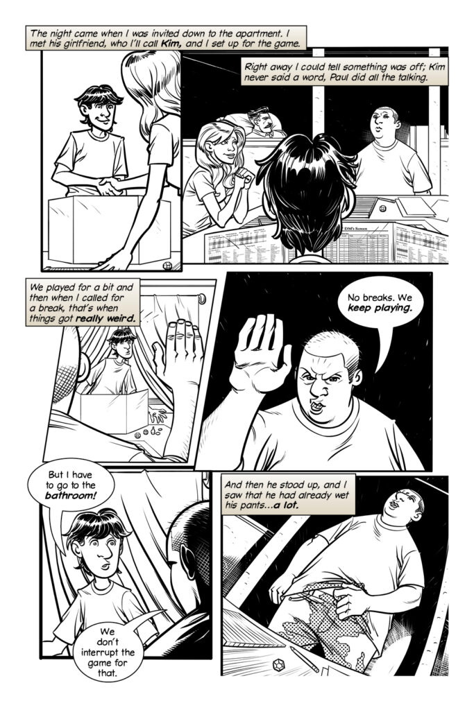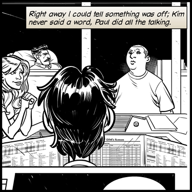 PANEL ONE: Stepanov’s apartment. MARK is setting up his DM screen on the dining room table, and greeting KIM, who is PAUL’s girlfriend.