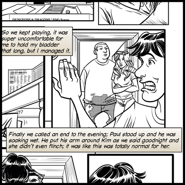 PANEL THREE: PAUL and KIM are standing, waving goodbye to MARK. PAUL has his arm around KIM. PAUL’s pants are drenched to the knees, as he has wet several times since we last saw him. He and Kim both look as if everything is normal.