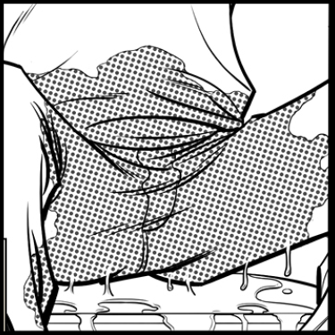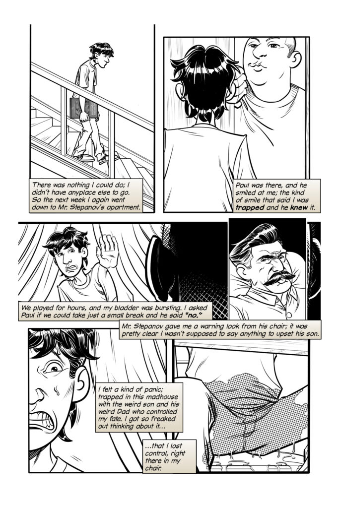 PANEL SIX: We pan down to look under the table at MARK wetting his pants like a fire hose.